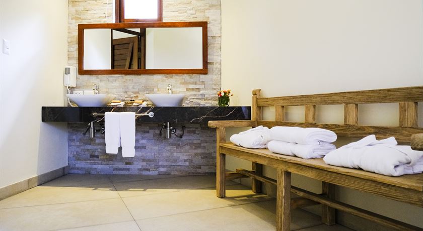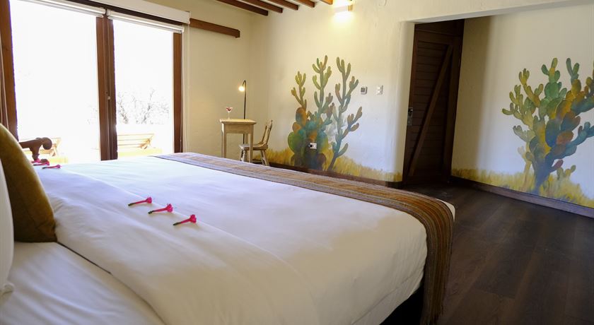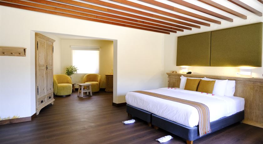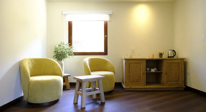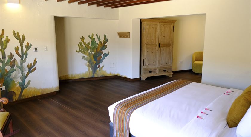 Suite con Terraza, cuenta con una cama king size, baño privado, grandes ventanales permiten disfrutar de una vista privilegiada del paisaje del valle, y se abren a una terraza privada equipada con tumbonas de madera, ideal para contemplar el entorno y desconectarse.